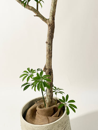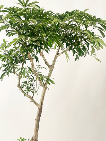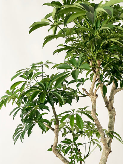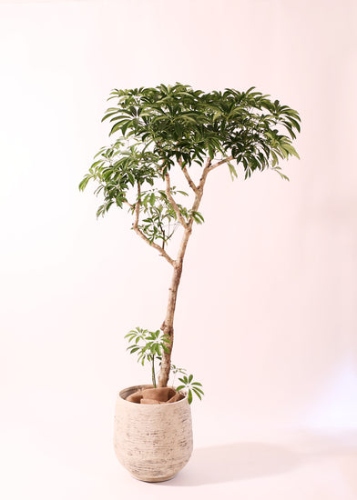 熱帯アジアからオセアニアにかけて分布し、数百種類あります。ひとつの枝から10枚ほどの小さな葉が付き、手を開いた時の様な形が特徴的です。 耐寒性・耐陰性にとても優れ、非常に丈夫なので、育てやすい植物です。日当たりがよく風通しのよい場所を好む植物なので、大きな窓のそばや、リビングなど明るい場所に飾るのがベストです。 土が乾いたらたっぷりお水をあげましょう。霧吹きなどで葉に水を拭きかける葉水を行うと、害虫対策になります。